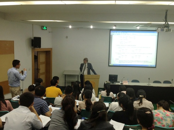 随后,Dryer教授围绕四个话题进行了演讲,分别是语序相关性;论指示词、数词、形容词和名词的语序;宾语配置的类型学研究以及为什么语言里有名词和动词?在这些讲座中,Dryer教授总结了以往存在的研究方法,提出了存在于这些研究方法中的缺陷,并提出了自己的研究方法。在每场讲座中,学员认真聆听讲座并提出了自己的问题,Dryer教授耐心的一一进行了解答,并和学员展开了充分的交流。