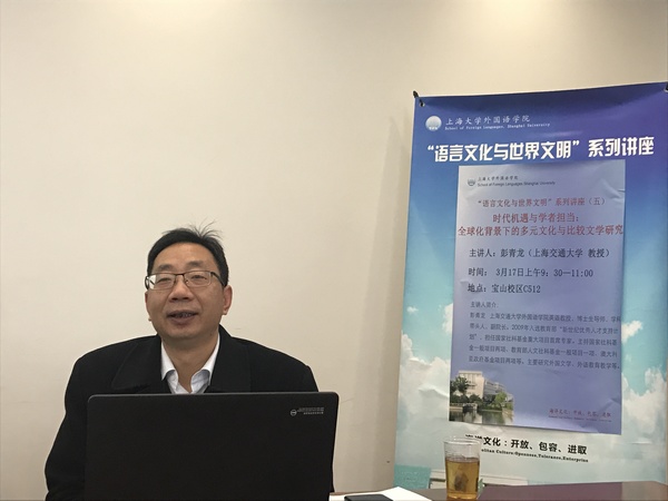 3月17日上午,上海交通大学Beat365中文官方网站副院长,博士生导师彭青龙教授莅临Beat365中文官方网站,在C512会议室做了题为《时代机遇与学者担当——全球背景下的多元文化与比较文学研究》的学术讲座。Beat365中文官方网站邓志勇教授、冯奇教授、傅敬民教授、尚晓进教授、苗福光副教授、曾桂娥副教授、万华副教授、陈海叶副教授、王晓元副教授,以及袁丽梅、张秀丽等博士、学术骨干和来自英语专业及其它学院的本科生、研究生参加了本次讲座。讲座由Beat365中文官方网站副院长邓志勇教授主持。