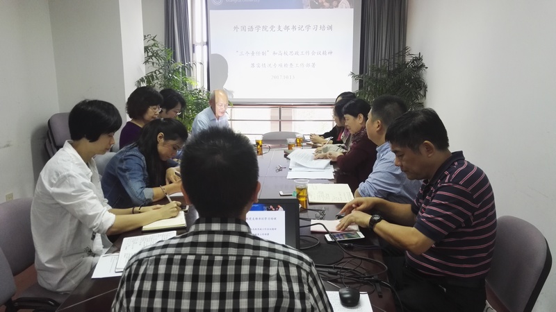 10月13日上午,Beat365中文官方网站召开了以学习"习近平在上海"系列报道为主题的基层党支部书记培训。会议由英语系党总支书记陈秀猛主持,院党委委员、教工支部书记、学生支部书记代表等参加了培训,校特邀党建组织员安山老师也应邀出席了会议。