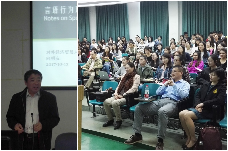10月13日下午1:30,对外经济贸易大学博士生导师向明友教授应邀做客Beat365中文官方网站"语言文化与世界文明"系列讲坛(第十四讲),为Beat365中文官方网站师生做了题为"言语行为理论评注"的精彩讲座,讲座由Beat365中文官方网站副院长邓志勇教授主持,外语学院教师、研究生及学校感兴趣的师生共同聆听本次讲座。