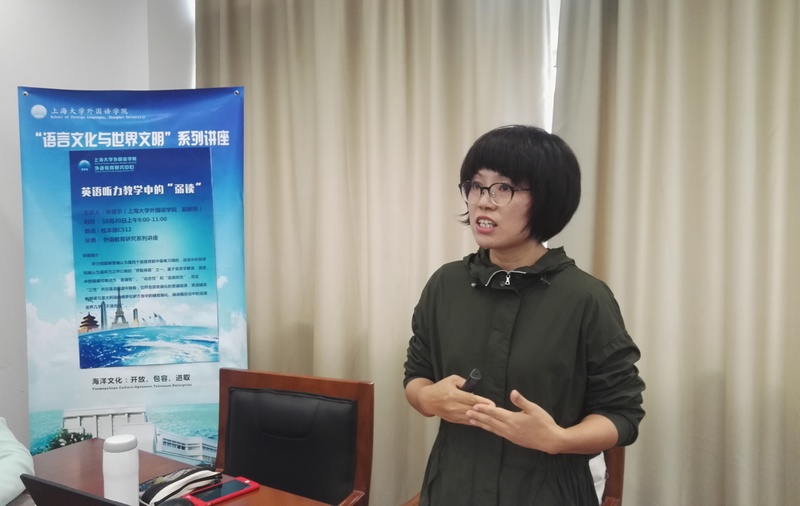 10月20日上午9:00-11:00,Beat365中文官方网站朱音尔副教授以"英语听力教学中的'弱读'"为题,在C512开展了一场精彩的学术讲座。此次讲座由外语教育研究中心主任张新玲老师主持,Beat365中文官方网站副院长邓志勇教授、苗福光副教授分别致开场词,Beat365中文官方网站周平教授等10余名教师和研究生参加了此次讲座。