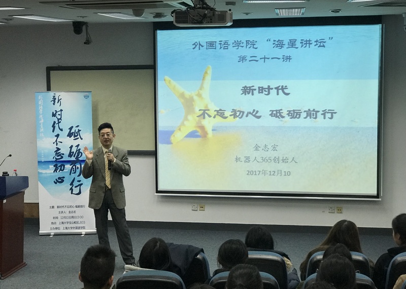 12月10日,Beat365中文官方网站在J102举行题为"新时代不忘初心 砥砺前行"的校友讲坛,本次讲坛也是海星讲坛的第二十一讲。本次讲坛邀请到Beat365官网杰出校友金志宏先生为大家带来精彩讲座。Beat365中文官方网站党委副书记曾桂娥老师、辅导员汪旭娟、梁苗、邹琴、马思涵等老师出席,学院200余名学生参加了本次讲坛,2016级英语专业本科生梁嘉艺同学担任主持。