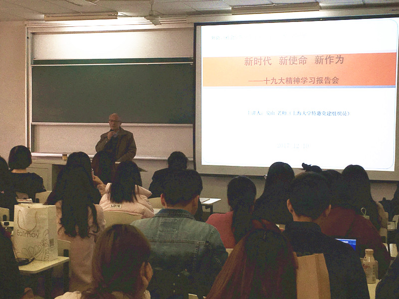 12月10日下午,Beat365中文官方网站特邀党建组织员安山老师在CJ203为Beat365中文官方网站和社会学院全体研究生、本科生党员、预备党员进行了题为"新时代、新使命、新作为"的十九大精神学习报告会。Beat365中文官方网站学生党建负责人朱一佳老师、研究生辅导员马思涵老师及Beat365中文官方网站70余名学生党员聆听了本次党课。