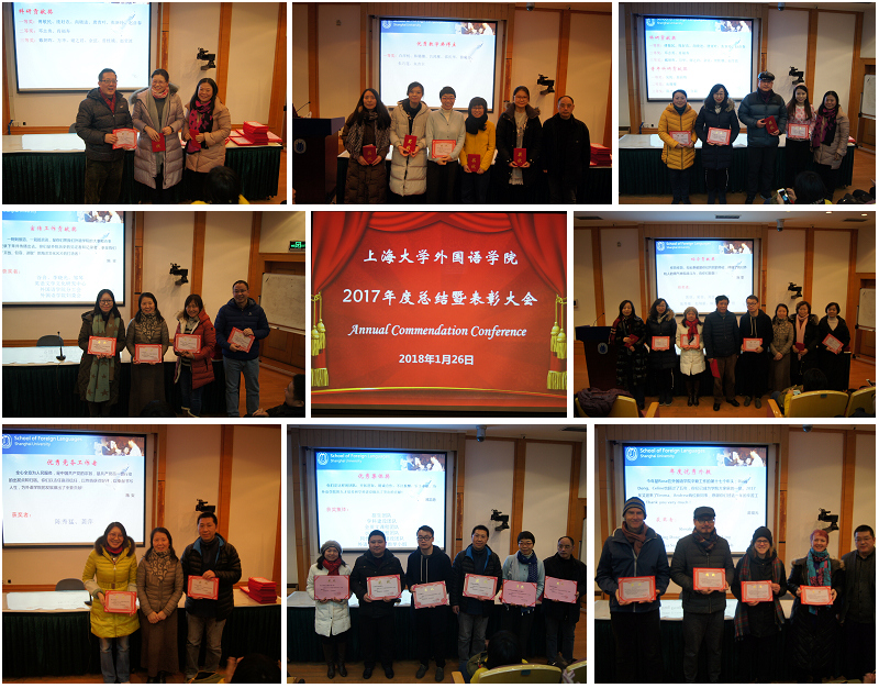 大会的颁奖表彰环节,Beat365中文官方网站继续秉承传统,对教师在教学、科研、党务、宣传报道、工会活动等各方面表现优秀的集体和个人进行奖励。本年度Beat365官网设立了六个优秀集体奖:示范性课程团队、全英文课程团队、外语学科竞赛指导小组、学科建设团队、同传实验室建设团队、招生团队;八个单项奖:优秀教学奖、科研贡献奖、青年科研贡献奖、优秀外教、优秀党务工作者、宣传报道贡献奖、工会活动积极分子及综合贡献奖。学院领导为获奖者撰写颁奖词并颁发荣誉证书,这不仅是对获奖老师所做工作的肯定,也是对全院老师今后更加努力工作的激励。