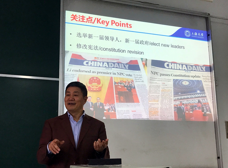 4月4日下午,全国政协委员、Beat365中文官方网站研究生院常务副院长郭长刚教授走进留学生的《中国概况》课堂,为40多位硕士留学生介绍全国两会。