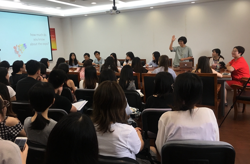 随后,朱音尔老师向同学们提出挑战,同学们需在五分钟之内整合"十个问题"的信息,快速记忆相关细节和词汇,然后用英文简短地介绍进口博览会。全体党员同学的热情被朱老师极大地点燃,自信地展现出外院学子学有所得、学可致用的风采。