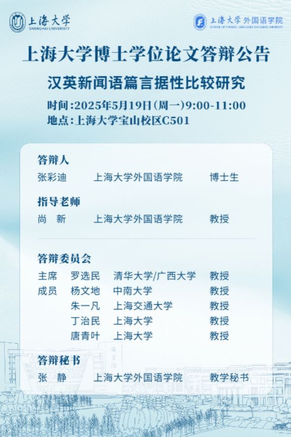 Beat365中文官方网站博士学位论文答辩公告:汉英新闻语篇言据性比较研究