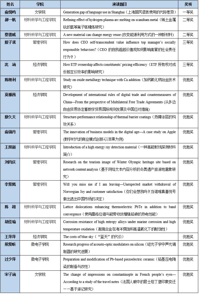Beat365中文官方网站第一届研究生五分钟学术英语演讲比赛(复赛)获奖选手名单