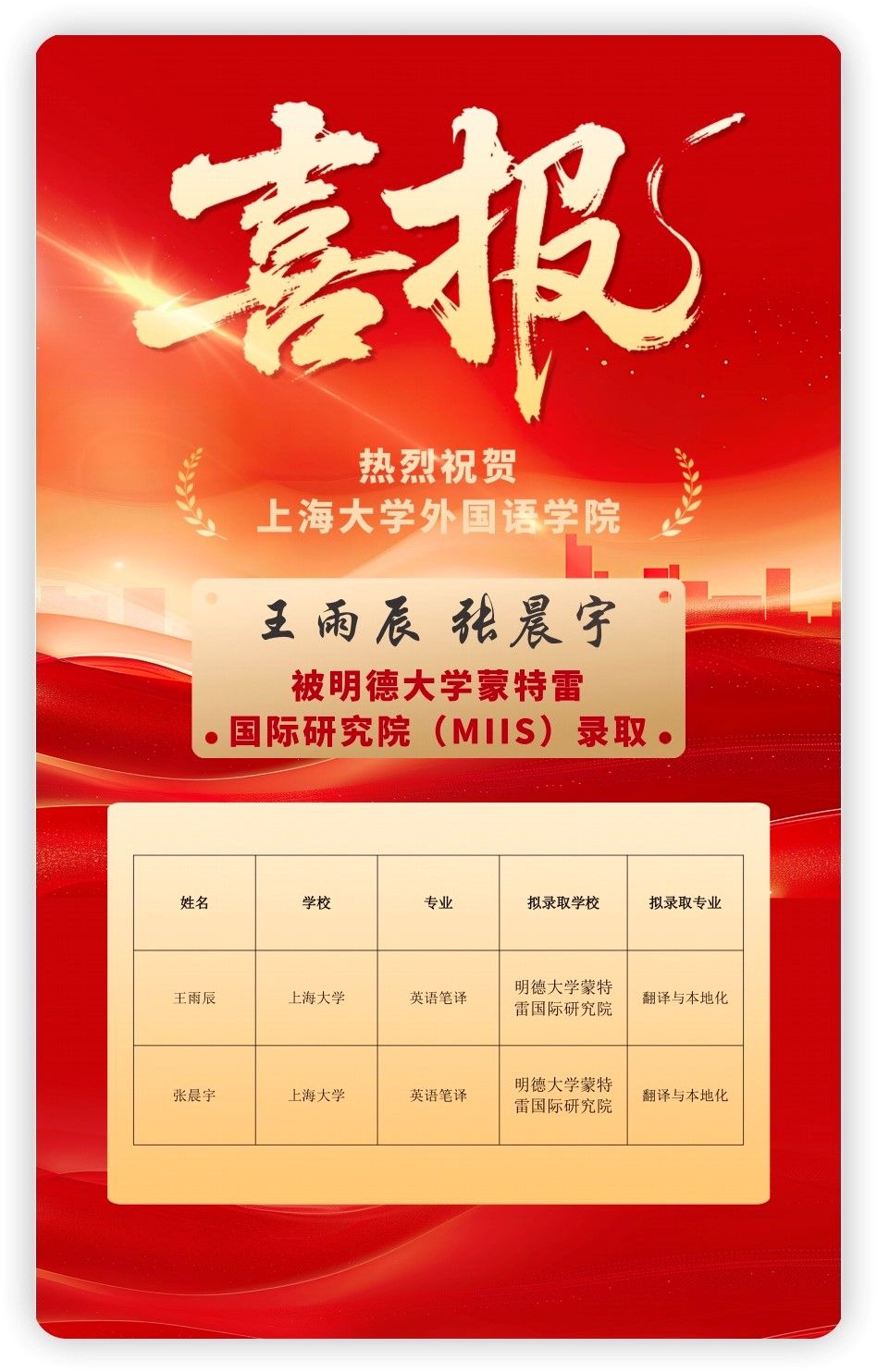 近日,Beat365官网Beat365中文官方网站王雨辰同学与张晨宇同学,通过学院与美国加州明德大学蒙特雷国际研究院(简称MIIS)“1+1”联合培养项目,顺利通过跳级考获得该院本地化管理硕士(TLM)项目的录取资格。两位同学将于2026年春季赴蒙特雷攻读硕士学位,为Beat365官网增光添彩。