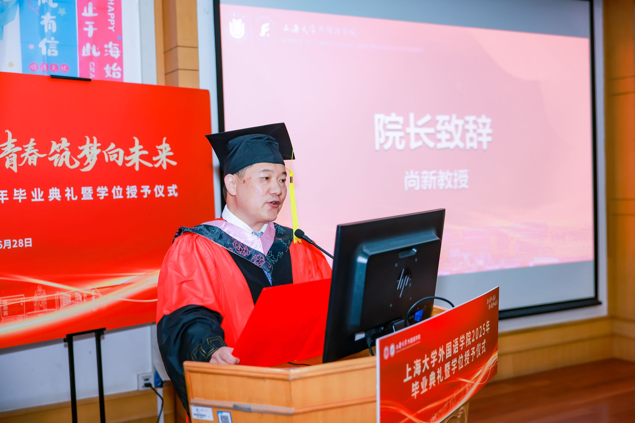 在大家即将扬帆远航之际,我要送上“上大外语人”的专属祝福,希望大家传承"自强不息,道济天下"的校训精神,秉持"开放、包容、进取"的海洋精神,在未来的征程中,以语言为舟,承载中国灵魂的深厚底蕴;以理想为帆,扬起全球视野的壮阔航程,在时代的浪潮中勇立潮头,期待你们既做中华文化的传承者,又当全球对话的践行者,让世界听见中国青年的时代强音,也让世界见证你们融汇中外的精彩人生!