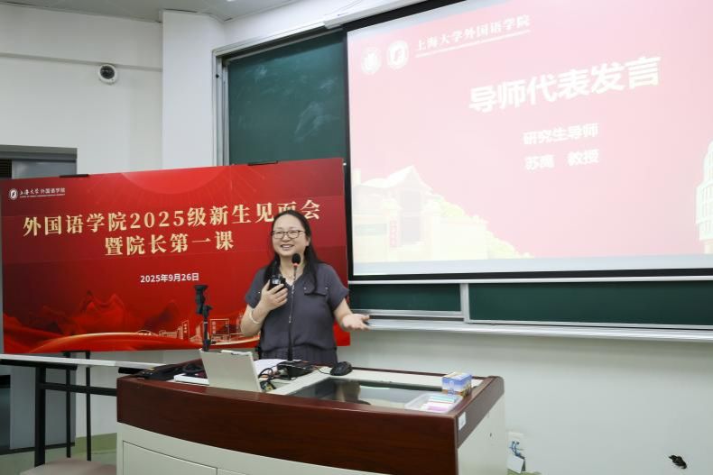 研究生导师代表苏鹰教授围绕“外语人的使命与成长”展开分享。她认为,在全球化与逆全球化交织的时代,外语人肩负着跨越文化、连接世界的重要使命,优秀的外语学子需要突破三重境界,以搭建跨文化沟通的桥梁:第一重是追求语言表达的正确,第二重是追问语言现象背后的原因,第三重是创造语言应用与文化传播的新可能。苏鹰教授将外语人比作语言桥梁与明灯,希望大家能将桥梁搭得更远,将灯点得更亮,并表示全体老师将为新生们的成长提供全力支持。