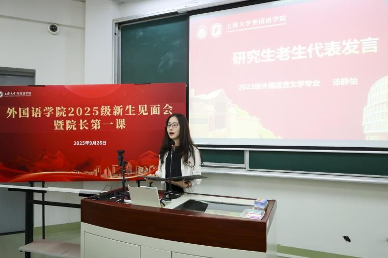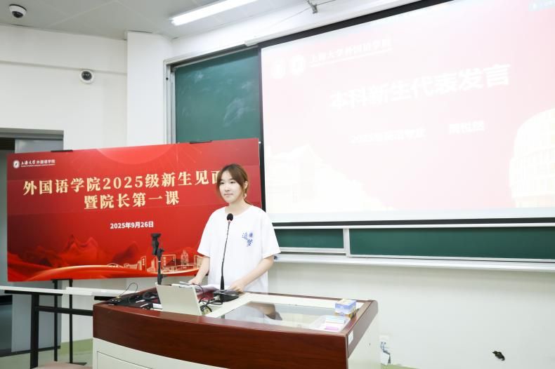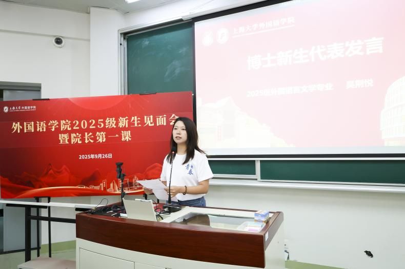 随后,2025级英语专业周悦然同学、2025级日语笔译专业莫非同学、2025级外国语言文学专业吴荆悦同学分别作为本科、硕士、博士新生代表发言。周悦然同学分享了对于语言学习的看法;她认为外语不止是一门学科,更是联结世界的纽带,同学们在语言学习的过程中应努力实现知识与能力上的双重成长,争做对国家有用的外语人。莫非同学以“敬自己”为主题,回顾了自己的求学之路,向大家分享了自己的跨文化翻译实践感悟;她认为本科学习注重广博,而研究生阶段更需专精,研究生阶段应以“不驰于空想、不骛于虚声”的态度深耕专业,通过不懈耕耘获得进步。吴荆悦同学表示她将在博士阶段珍惜宝贵的学术共同体,持续触及知识的边界,以勤奋为桨、思辨为帆,在学术道路上坚定前行,致力于文化阐述与沟通。