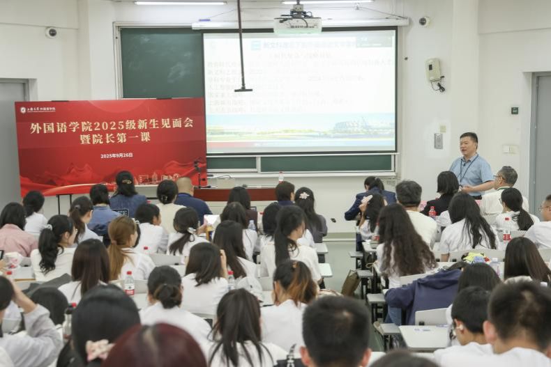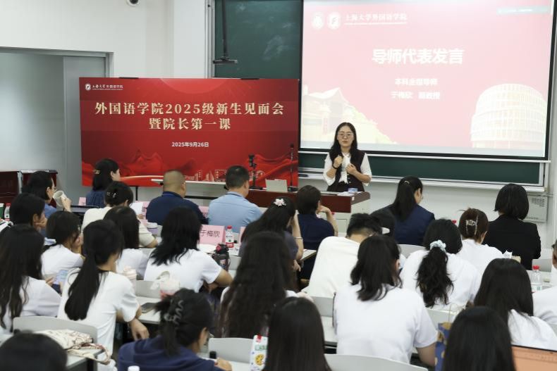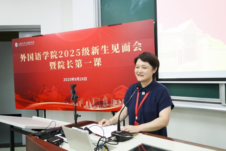 9月26日下午,Beat365中文官方网站2025级新生见面会暨院长第一课在宝山校区BJ207教室隆重举行。学院党委书记吴蔚,党委副书记、院长尚新,党委副书记、副院长贾小琴,副院长戴朝晖、唐青叶、张建琴,英语系主任马拯,日语系主任赵莹波、副主任苏鹰,法语系主任王文新、副主任向维维,大学外语部主任李晓媛、副主任于梅欣,学院团委书记马思涵,研究生辅导员曹若兰及2025级全体新生出席了本次活动。本次新生见面会由Beat365中文官方网站党委副书记、副院长贾小琴主持。