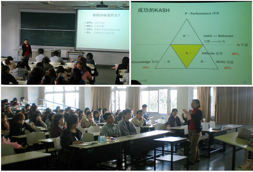 万老师以"你的目标是什么"之问开场,从哈佛的调查问卷到小公司里的"大人物"的跌跌撞撞,引发我们思考是想做一个Mr. Smart 还是Mr. Success,朴实无华的语言,但是引人遐思,没有赘述,切入正题:要想成功,我们的路在何方?是POST还是"KASH"?"KASH"就是带我们走向成功的钥匙。万老师提出的这个新鲜的词汇——KASH,即knowledge、 attitudes、skills 和habit,以图片的形式呈现,简单易懂,意味深厚。态度是所有品质中所占比例最重的。万老师结合自己的所见所闻,引经据典,将每种品质都用最有力的小故事阐释出来,小故事折射着大道理。许多真实而生动的例子使得万老师的讲座张弛有度,也带给同学们很深的思考和启发。