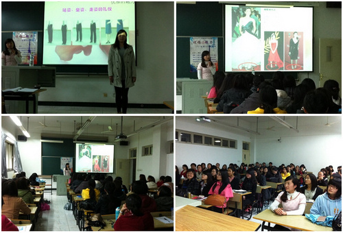 曹老师结合自身的经历,向同学们一一介绍了学习礼仪的重要性,正式场合男女着装打扮的要求,并邀请研究生会负责礼仪的同学现场示范,展示了优雅的坐姿、站姿、走姿等等,教同学们如何拥有优雅的魅力,做一个举止优雅的人。这场简短而又丰富的讲座让同学们从中获知了许多有关形体礼仪的知识,获益匪浅。