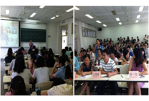 参加答辩的队伍包括城市规划馆志愿者、都市和谐话语调研、第八届大场镇暑期爱心小学和2012年上海电视电影节志愿者四个项目团队。首先,四位项目负责人在5分钟的时间内从项目立意、运作情况、媒体宣传、社会效应、学生参与度、综合成果等几个方面进行了项目陈述,图文并茂地向评委们展示和分享了项目的实践过程以及队员们的心得和收获。随后接受了评委老师和大众评委的提问,例如"对当今社会大学生崇尚奥运、世博等光鲜亮丽的志愿者角色,却对身边需要帮助的弱势群体漠不关心,你怎么理解?"、"尽管对南京东路街道的不和谐用语进行了细致的梳理,并形成了调研报告,但是否考虑过如何将调研成果反馈给相关部门,从而发挥其社会效应?"等。面对犀利的提问,几位答辩者随机应变,稳定发挥,体现了良好的心理素质和较强的语言表达能力。最后学院团委依据评委评分和学生投票综合评选出"大场镇暑期爱心小学"和"上海电视电影节志愿者"作为优秀团队,并进行了公示。