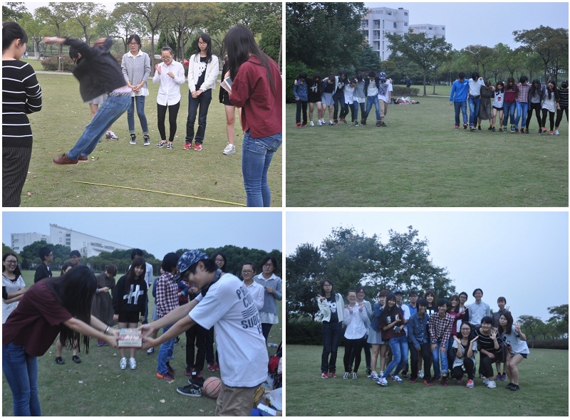 首先,大家用日语介绍自己,相互认识并简单地交流了一下各自的学习和生活。然后就开始进行了趣味比赛的环节。首先第一项:踢毽子游戏,留学生们虽然是第一次尝试,但是成绩也很不错,游戏规定优胜队要完成口传吸管游戏才能获得奖励哟。随后的第二项反向跳远很有趣但是也很难;第三项游戏打野鸭,同学们领会了要领是要不被球打到一定要反应敏捷;最后的八人九足,则绝对是团队协作精神的一个大挑战。