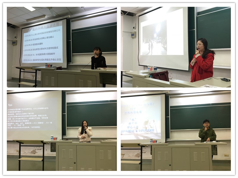 在"保研推免,并非高不可攀——2017年优秀直研学生心得交流"环节中,成功保研到华东师范大学对外汉语专业的张璐学姐与大家分享了"华师大圆梦之旅",她不仅为同学们梳理了保研相关流程及时间安排,还提醒学弟学妹一定要"多留意夏令营,赢在起跑线"、"多关注各学校推免时间"等注意事项。成功保研到上海外国语大学英语语言文学专业口译学方向、获得2015-2016学年国家奖学金的2014级英语系王舒雅学姐,与大家分享了自己三年多的奋斗历程。王舒雅同学牢记上海"自强不息,先天下之忧而忧、后天下之乐而乐"的校训,在学习上对自己严格要求、合理规划、与时间赛跑,在保研时积极向学长学姐请教经验,同时认真复习备考,最终成功以出色的表现赢得了自己心仪的"offer"。