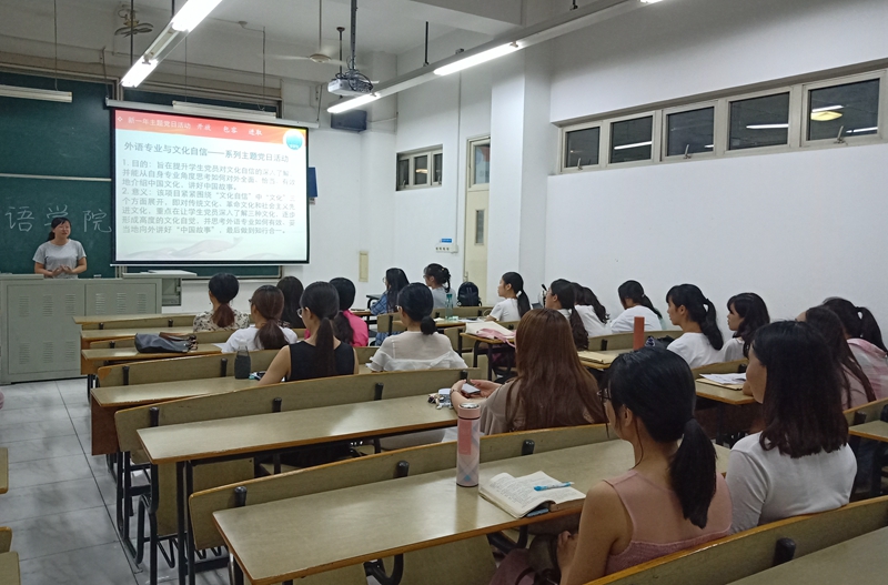 会议上,吴凡首先简要介绍了学院研究生党总支的组织构架和学院党建发展概况,严肃强调了学生党建纪律,要求党员活动严格实施签到制度。吴凡结合学院特色向大家重点介绍了海星微党课,提出了将外语专业与文化自信融合的系列主题党日活动规划,号召大家积极响应。随即,2018级党员干部进行自我介绍,表示希望在今后的工作中能做出积极奉献。随后,研究生党总支组织委员田丹妮就党组织关系转移的注意事项向大家做了详细说明。