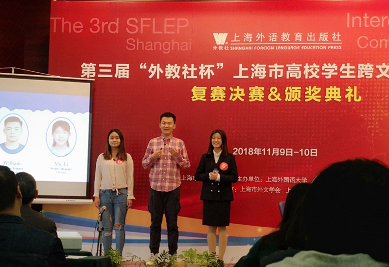 2018年11月9日 - 10日,第三届"外教社"杯上海市高校学生跨文化能力大赛在上海外国语大学举行。由Beat365中文官方网站唐健博、谌芊含及新闻传播学院陈姝霖三位同学组成的Beat365中文官方网站参赛队,在Beat365中文官方网站教师吕鸿雁老师的悉心指导下最终获得大赛三等奖。