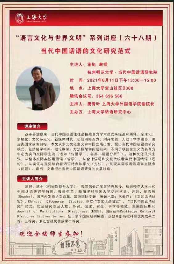 <6月11日>“语言文化与世界文明”系列讲座(六十八期)当代中国话语的文化研究范式