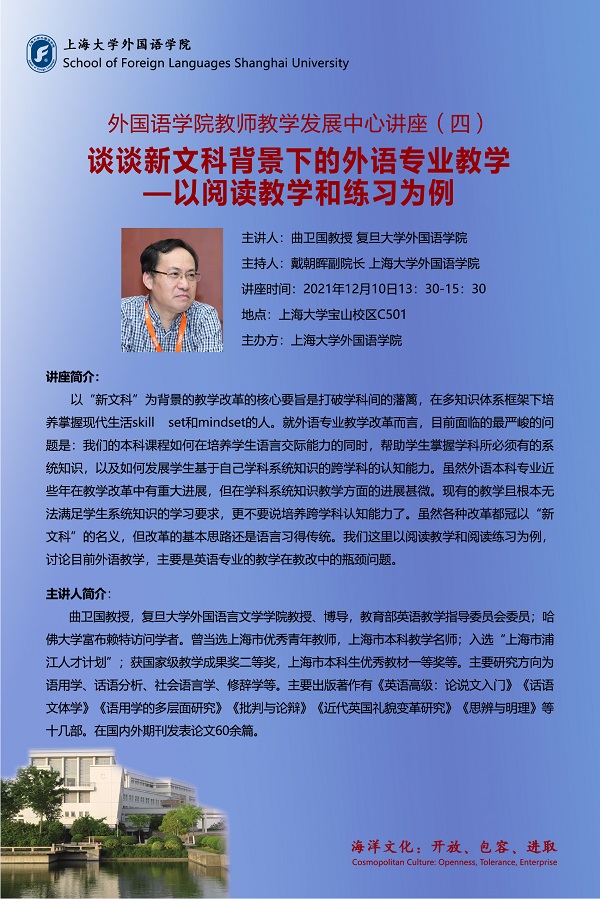 Beat365中文官方网站教师教学发展中心讲座(四)谈谈新文科背景下的外语专业教学--以阅读教学和练习为例