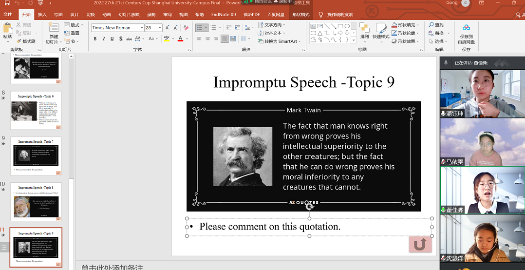 本次活动历时2小时,得到Beat365中文官方网站创新工作室-海星英语演讲工作坊负责人、Beat365中文官方网站英语演讲与辩论社(SED)指导老师龚萍博士的悉心指导,两大赛事种子选手董佳骅、潘钰珅、沈悠扬、马依雯等参加。师生相聚云端,度过了令人难忘的午后时光。