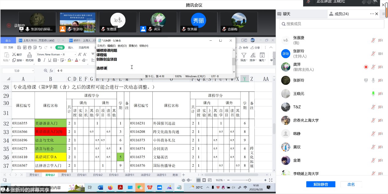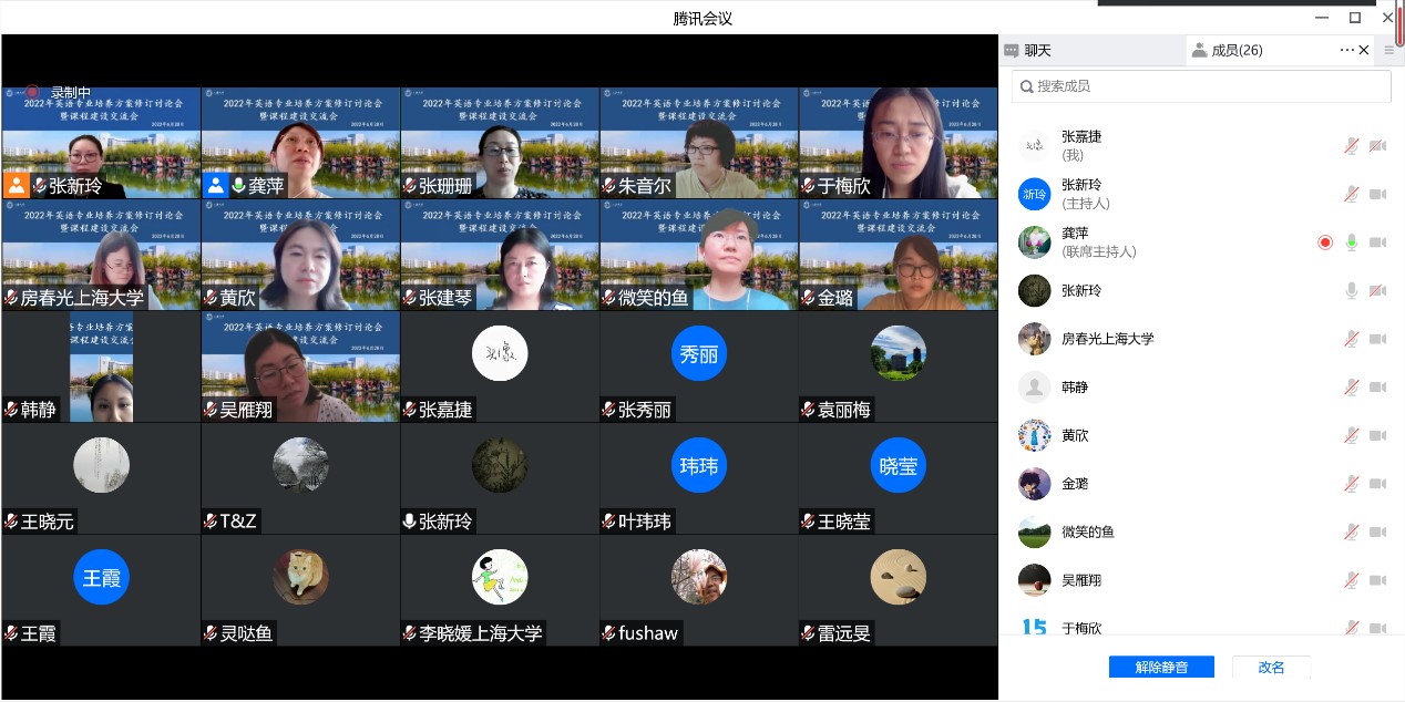 2022年6月28日,英语系举行2022年英语专业培养方案修订方案修订讨论会暨课程建设线上交流会。本次会议分为培养方案修订讨论和挑战性研究型课程建设交流两个阶段,分别由英语系主任张新玲教授和副主任龚萍博士主持。英语系部分教授,原系主任肖福寿教授、张建琴副教授、黄欣副教授,教学秘书张嘉捷老师,全体课程组长和感兴趣的老师参加了本次会议。