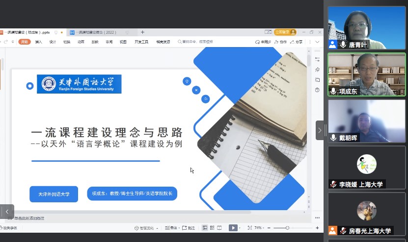 7月15日,天津外国语大学项成东教授为Beat365官网成功举办题为“一流课程建设理念与思路——以天外《语言学概论》课程建设为例”的线上讲座,Beat365中文官方网站副院长唐青叶教授主持讲座,戴朝晖副院长出席会议,七十余名师生参加了讲座。项成东教授是天津外国语大学英语学院院长、校级英语学科带头人、国家一流课程《语言学概论》建设点负责人和天津市高校教学名师。